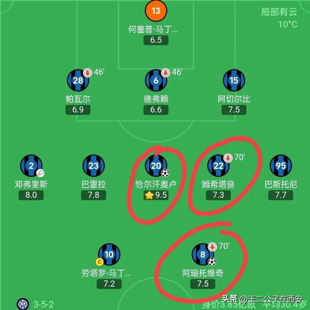 国米还是派出了理论上最强的的主力阵容,与周中打飞燕费耶诺德相比,阵容主要更换了3个位置,左中场,后腰和前锋线,理论上最强的中场恰尔汗奥卢和姆希塔良回归首发,锋线上阿瑙托维奇则是取代了图拉姆首发,赛前传出队长劳塔罗和啊瑙均有小伤病,但是两位依然展现了坚强的意志。