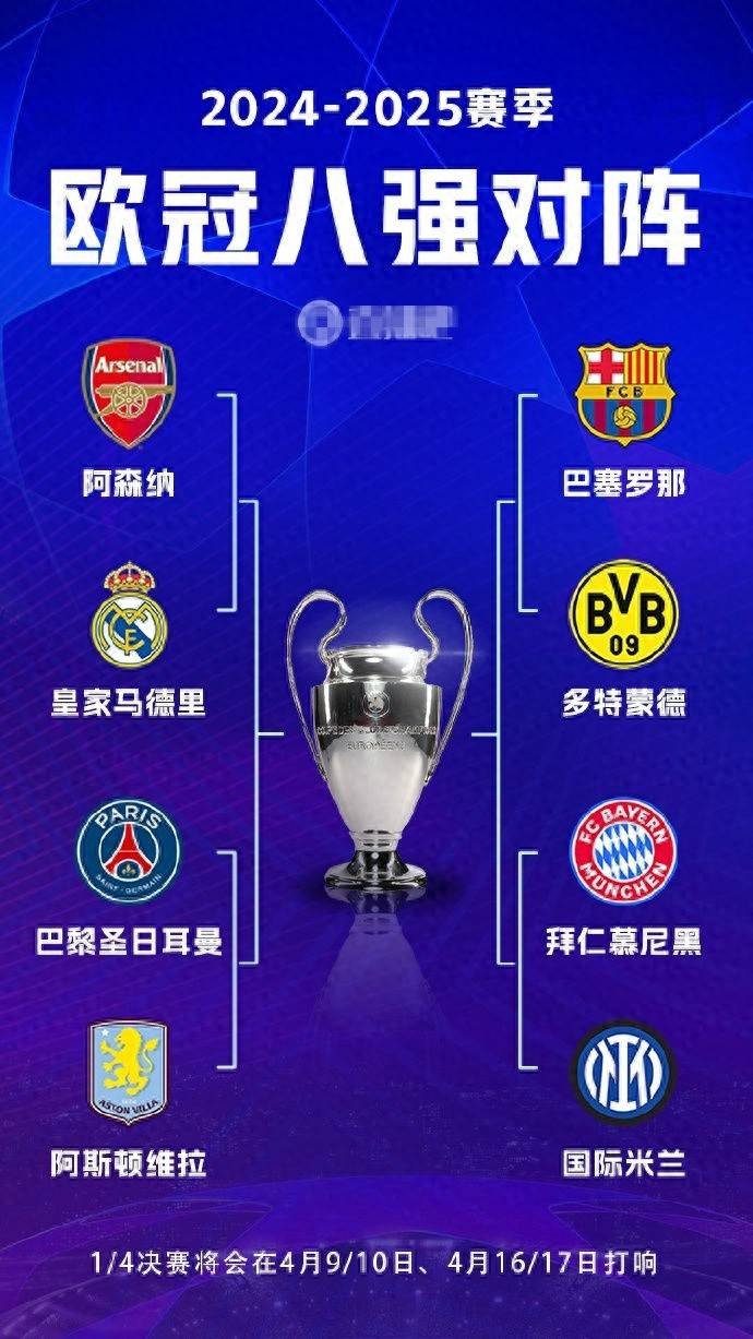 随着皇马6-4马竞+阿森纳9-3,欧冠8强全出炉,具体对阵+时间如下