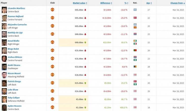 直播吧3月18日讯 德转更新了部分英超球员身价,在此次更新中有13位曼联球员身价发生了变化,其中9人出现下跌,4人出现上涨。