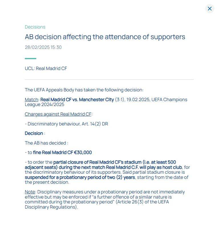 处罚为:罚款3万欧+对皇马主场伯纳乌球场做出关闭部分看台(至少500个相邻座位),但是关闭看台的处罚缓期2年执行,如果期间再有类似性质的违规行为出现,这项处罚将立即生效。